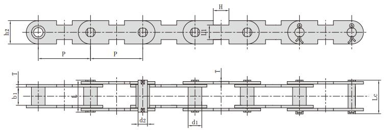 鏈號 節距 套筒直徑 內節內寬 銷軸直徑 銷軸長度 內鏈板高度 鏈板厚度 附件尺寸 抗拉強度 每米長重