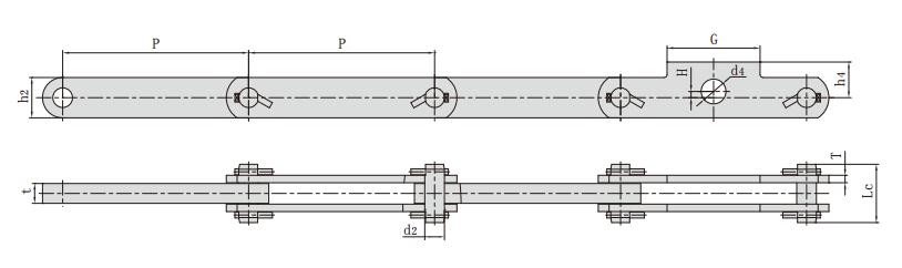 鏈號 節(jié)距 銷軸直徑 銷軸長度 內(nèi)鏈板高度 鏈板厚度 附板尺寸 抗拉強度 每米長重