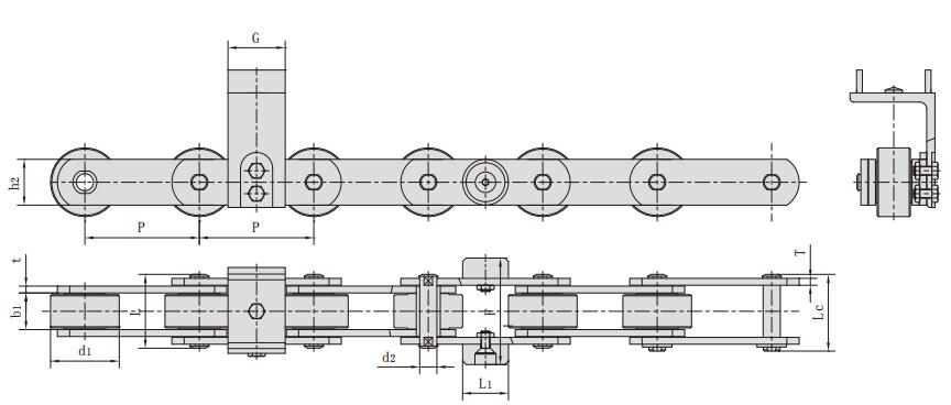鏈條型號 節距 滾子直徑 內節內寬 銷軸直徑 銷軸長度 內鏈板高度 鏈板厚度 附件尺寸 抗拉強度 每米長重