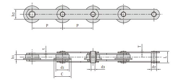 鏈號 節(jié)距 內節(jié)內寬 滾子直徑 銷軸直徑 銷軸長度 鏈板高度 鏈板厚度 抗拉強度 平均抗拉強度 每米長重