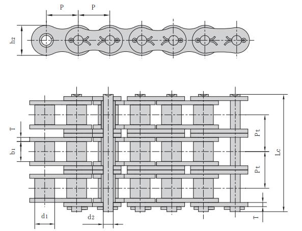 鏈號 鏈號 節距 滾子直徑 內節內寬 銷軸直徑 銷軸長度 內鏈板高度 鏈板厚度 排距 抗拉強度 平均抗拉強度 每米長重