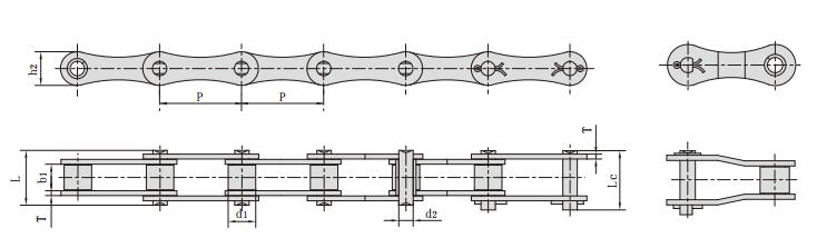 鏈號 節距 滾子直徑 內節內寬 銷軸直徑 銷軸長度 鏈板尺寸 抗拉強度 平均抗拉強度 每米長重