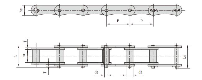 鏈號 節(jié)距 滾子直徑 內(nèi)節(jié)內(nèi)寬 銷軸直徑 銷軸長度 鏈板高度 鏈板厚度 抗拉強(qiáng)度 每米長重