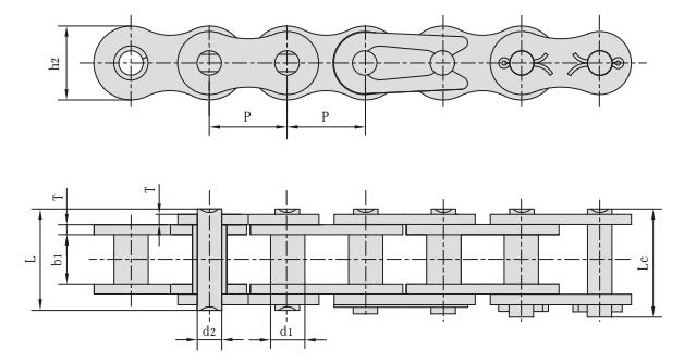 鏈號 節(jié)距 套筒直徑 內(nèi)節(jié)內(nèi)寬 銷軸直徑 銷軸長度 內(nèi)鏈板高度 鏈板厚度 抗拉強度 平均抗拉強度 每米長重