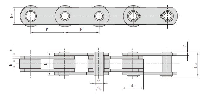 鏈號(hào) 節(jié)距 滾子直徑 內(nèi)節(jié)內(nèi)寬 銷(xiāo)軸直徑 銷(xiāo)軸長(zhǎng)度 內(nèi)鏈板高度 鏈板厚度 抗拉強(qiáng)度 平均抗拉強(qiáng)度 每米長(zhǎng)重