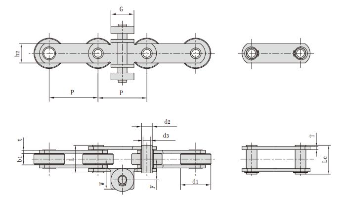鏈號 節距 滾子直徑 內節內寬 銷軸直徑 銷軸長度 內鏈板高度 鏈板厚度 附件尺寸 抗拉強度 每米長重