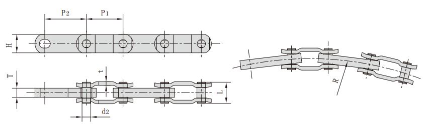 鏈條型號 節距 節距 內鏈板厚度 銷軸直徑 銷軸長度 鏈板尺寸 側彎半徑 抗拉強度 每米長重