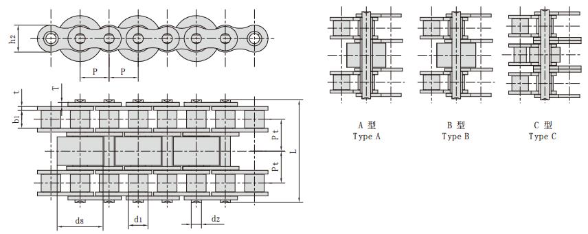 鏈號 節(jié)距 滾子直徑 內(nèi)節(jié)內(nèi)寬 銷軸直徑 銷軸長度 鏈板尺寸 排距 抗拉強度 平均抗拉強度 型號