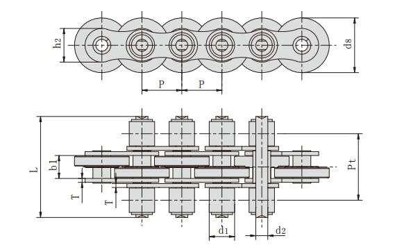 鏈號 節(jié)距 滾子直徑 內節(jié)內寬 銷軸直徑 銷軸長度 鏈板尺寸 排距 抗拉強度 平均抗拉強度
