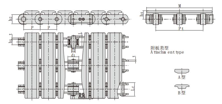鏈號(hào) 節(jié)距 滾子直徑 內(nèi)節(jié)內(nèi)寬 銷軸直徑 銷軸長度 鏈板高度 鏈板厚度 附板尺寸 抗拉強(qiáng)度 附板類型